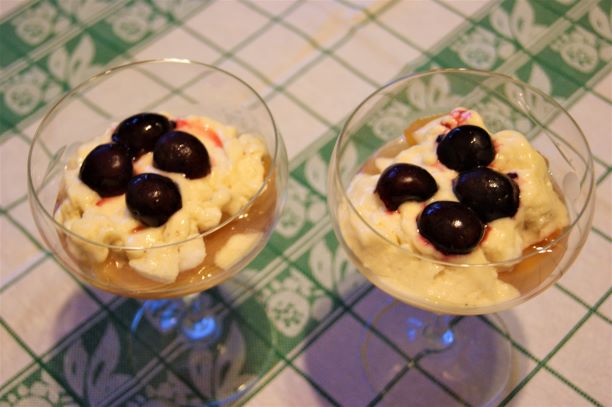 Per questa evocativa ricetta (almeno per me) occorrono: quattro belle pesche gialle, 125 g di zucchero di canna, alcune ciliegie nere snocciolate (in mancanza della frutta fresca vanno bene anche le amarene sciroppate), una banana matura, un albume, grappa di ciliegie o altro liquore.