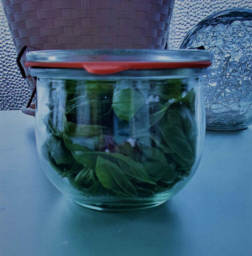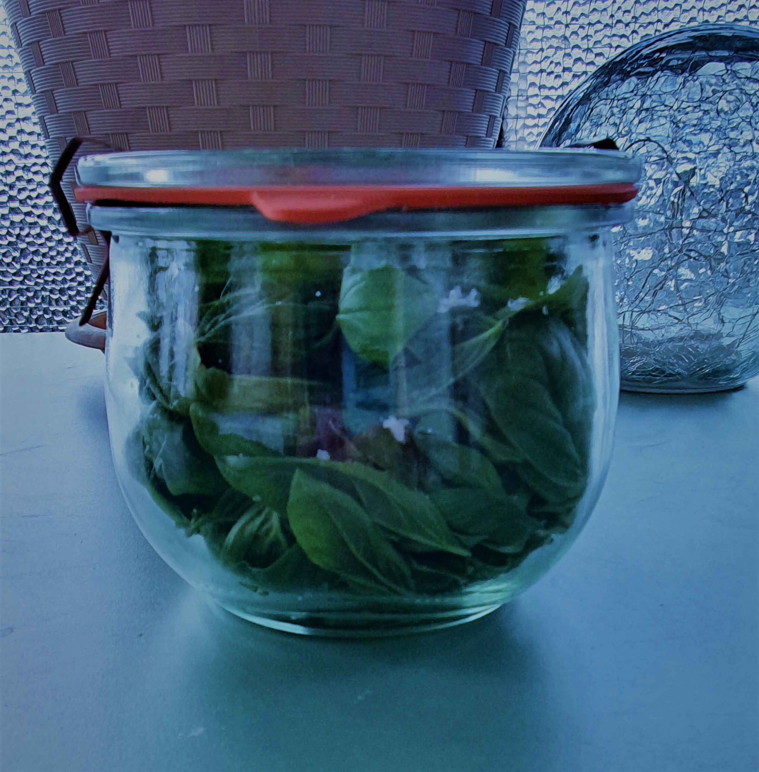 Scegliete attentamente le foglie più sane, lavatele accuratamente e asciugatele in un telo bianco badando che non si rovinino. Sistemate il basilico in vasi di vetro, alternando strati di foglie a strati di sale fino. Per ultimo, uno strato di sale, più un velo di olio d’oliva. Il basilico così trattato è molto salato, quindi mano leggera negli alimenti di accompagnamento.